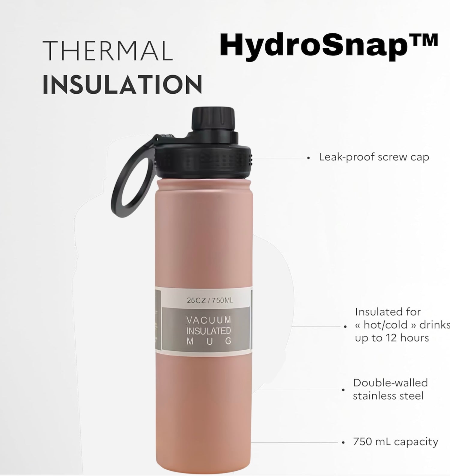 HydroSnap™ is made with double-wall 304 stainless steel insulation, keeping drinks cold for up to 12 hours and hot for up to 6 hours, depending on conditions.